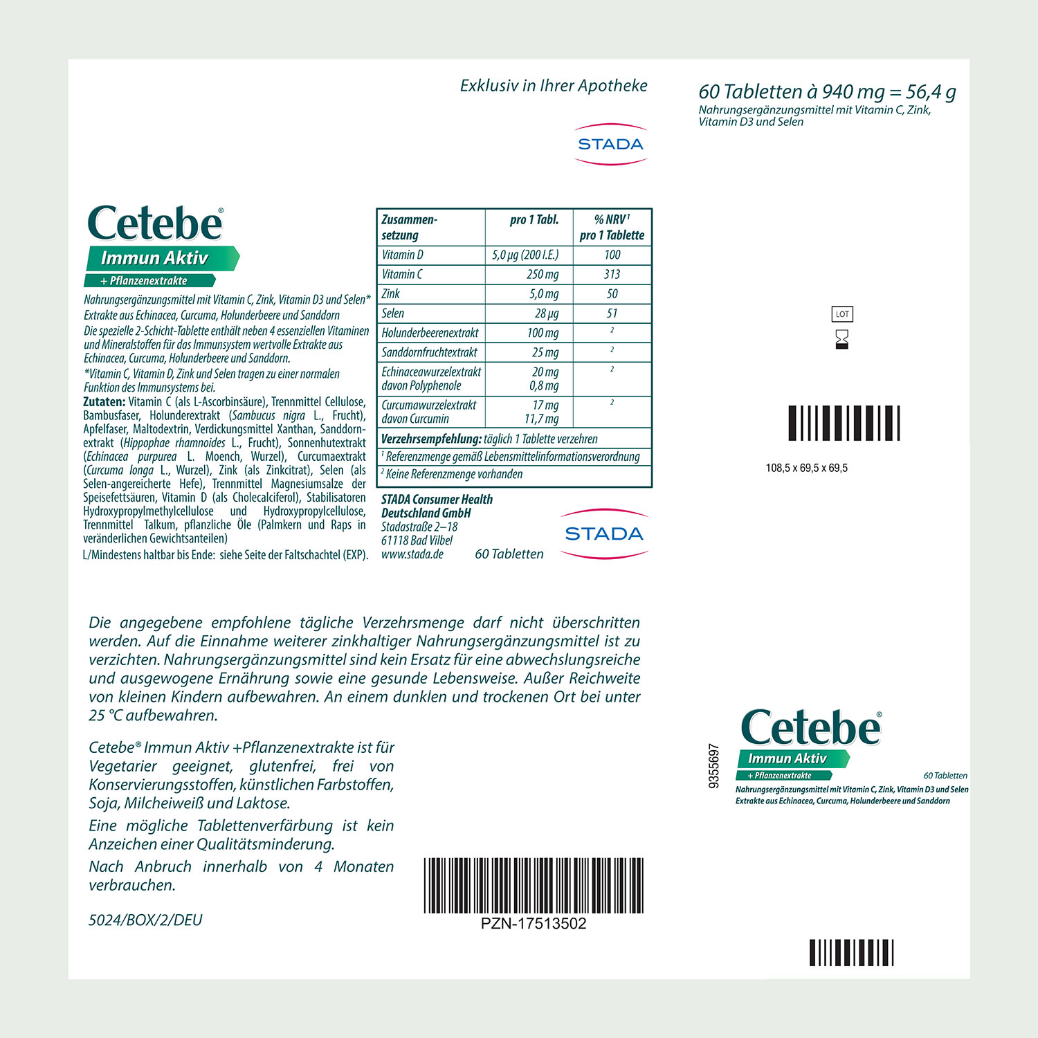 Cetebe® Immun Aktiv ist für Vegetarier geeignet. Außerdem ist das Nahrungsergänzungsmittel glutenfrei, frei von Konservierungsstoffen, künstlichen Farbstoffen, Soja, Milcheiweiß und Laktose.